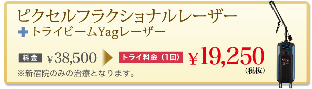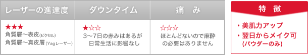 トライビームYagレーザーの1064nmの波長で真皮層の皮膚の再生を刺激し、ピクセルフラクショナルレーザーの2940nmの波長で皮膚の表面を入れ替えます。トライビームYagレーザーは、正常な皮膚にはダメージを与えず、真皮層にピンポイントでハイパワーの照射を行うことができます。一方、ピクセルフラクショナルレーザーは、1㎠あたり75本のレーザーで1mm程度の深さの点状の照射を行います。