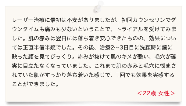 この細かな穴を修復しようと、コラーゲンが増幅します。この肌の再生力を利用し、肌表面の入れ替えを行います。皮膚表面の角質は温存されるため、表皮を削るレーザーと比較して肌へのダメージが少なく、ダウンタイムが短く安心して治療を受けていただけるのが特徴です。治療当日はヒリヒリとした感じが残る場合もありますが、数時間でおさまることがほとんどです。翌日以降、軽い赤みや腫れが残る場合もありますが、ほとんどの場合はメイクが可能です(パウダーのみ)。皮膚再生の過程で2~3日後、かさぶたが形成されますがだいたい10日前後で改善します。